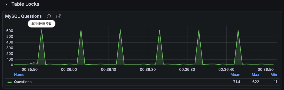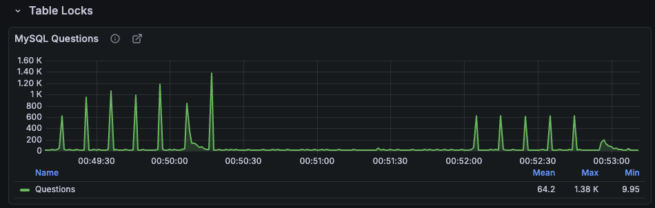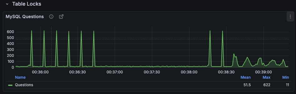 매 10초마다 약 600 QPS의 스파이크가 반복되는데 이 패턴은 단기적 문제로 끝나는 것이 아니라 지속적으로 DB에 충격을 가하는 구조다. 실제 서비스에서는 이러한 주기적 폭발이 슬로우쿼리 증가 → connection pool 고갈 → 장애로 이어질 수 있다.