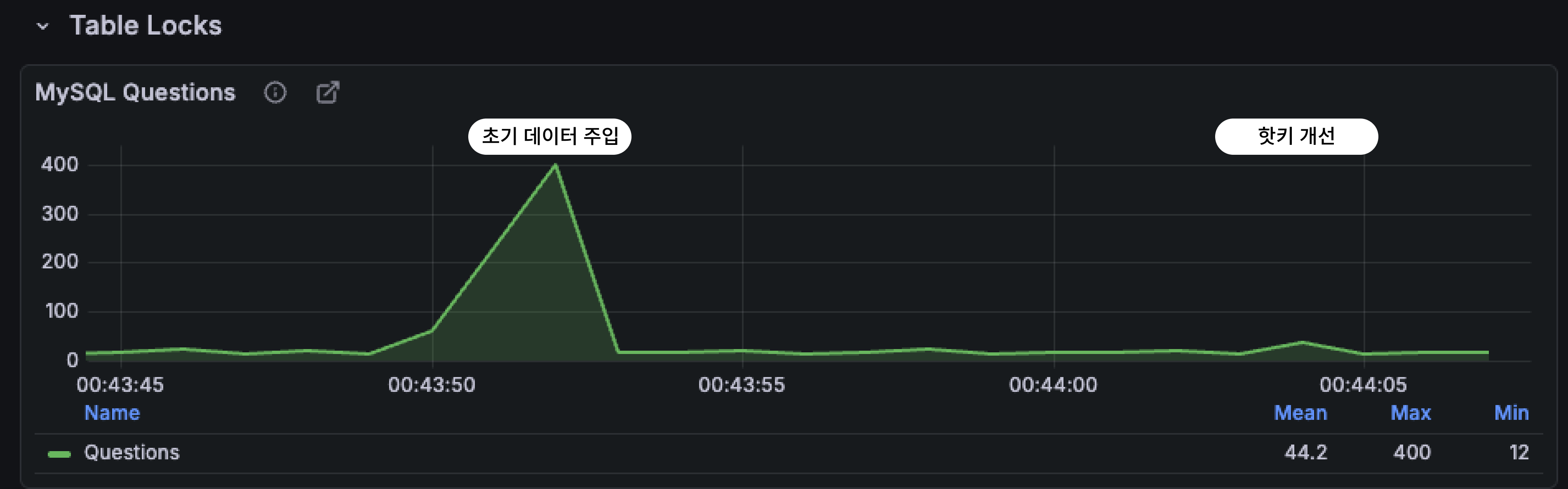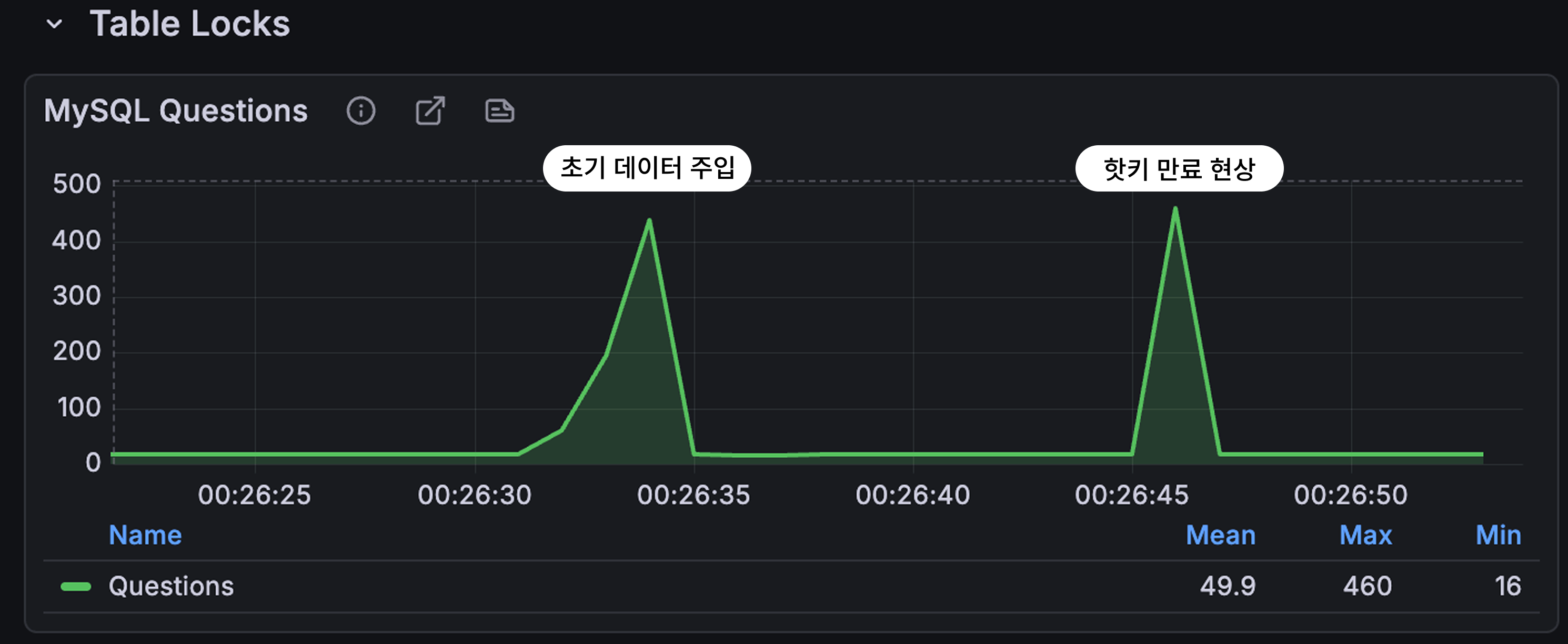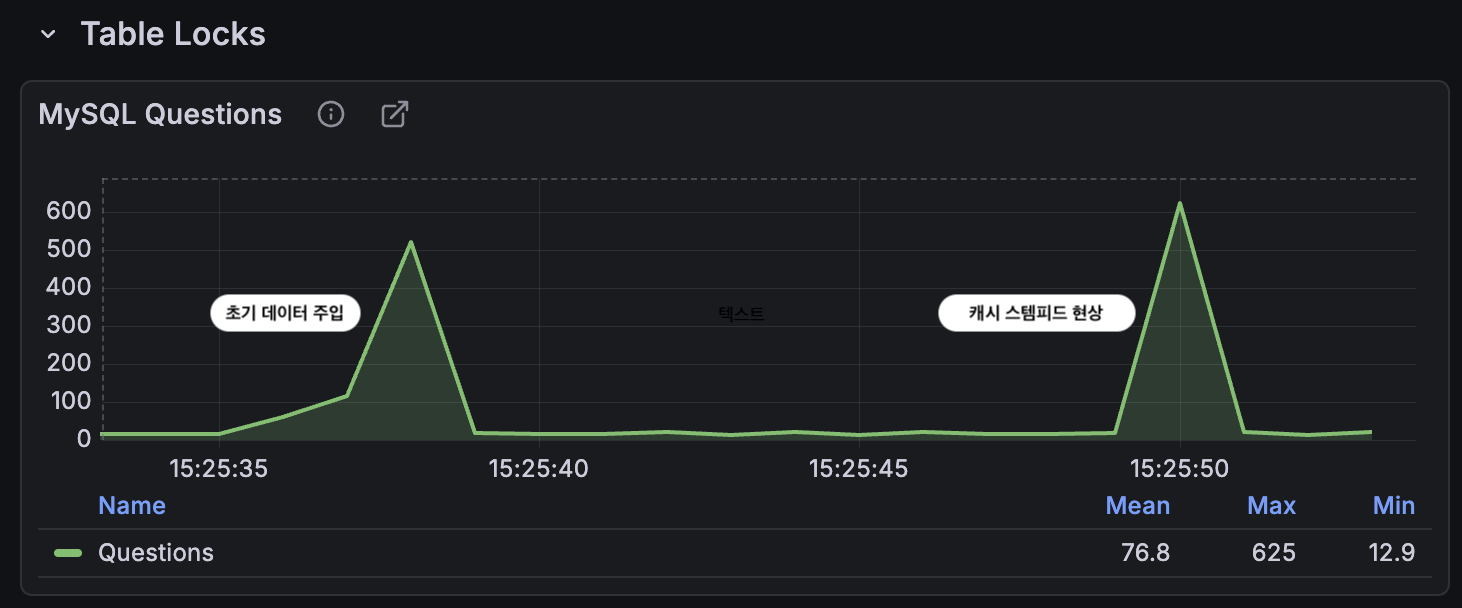 캐시 TTL이 10초였기 때문에 TTL 만료 직후 1초 동안 QPS가 약 평균 10 → 600으로 수직 상승했다.