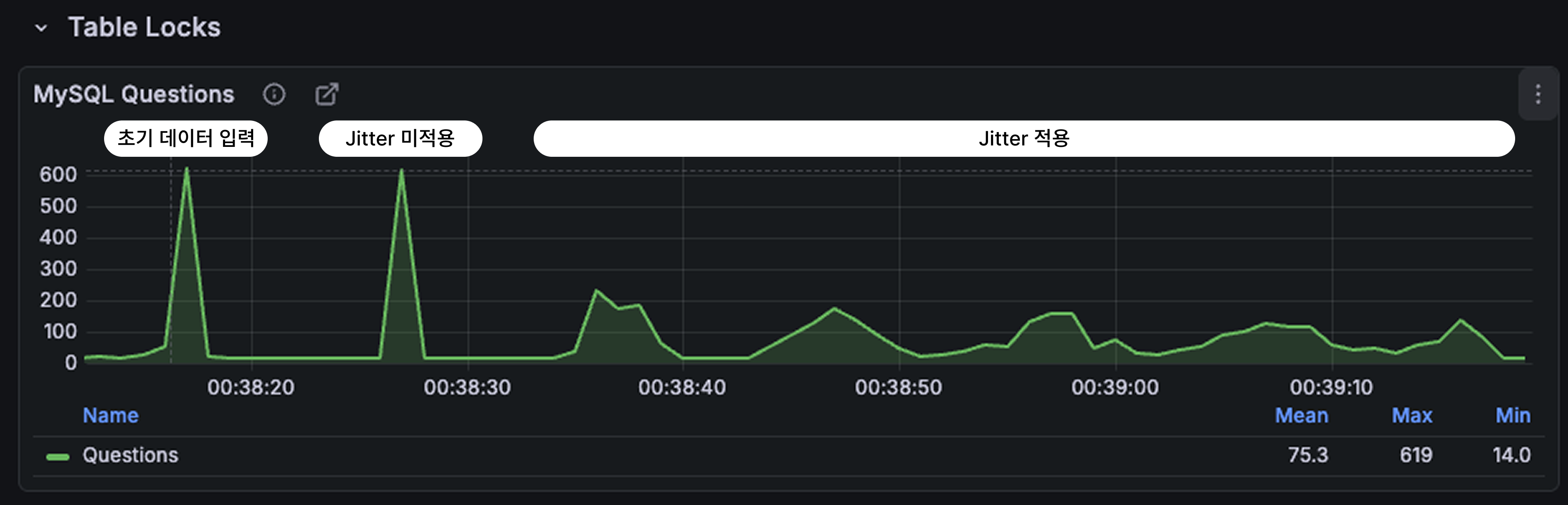 처음 QPS상승은 초기 데이터 조회 및 캐싱을 위한 부하증가이며 두번째는 처음 캐싱에 Jitter가 적용되어 있지 않아 동시에 만료되어 부하가 증가된 현상이다.